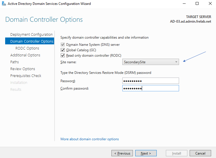 I select «Read Only Domain Controller”. Due to my preparations earlier, the Site Name is automatically set to correct site. I set a good DSRM-password, which I document, Next…