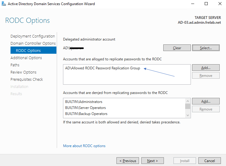 I leave the default group settings for replication of passwords. If this was a production environment I would probably have a usergroup with the users located in this new location, which I would add to “Allowed RODC Password Replication Group”, Next…