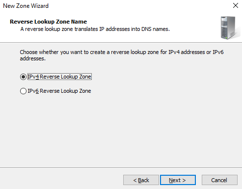 I don’t use IPv6, I select IPv4 Reverse Lookup Zone, Next…