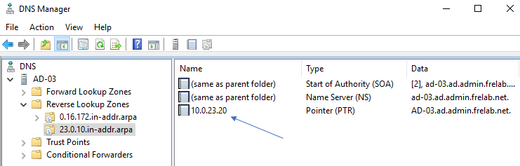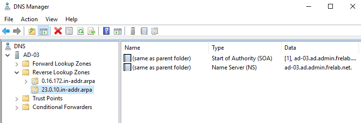 I add a new reverse zone for my new subnet, 10.0.23.0. In hindsight, I probably should have done this to begin with, when I was prepping AD for my new site