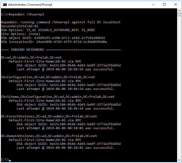 As we can see from the results above, AD-03 is not listed as Source DSA, this is because it is a Read Only Domain Controller.