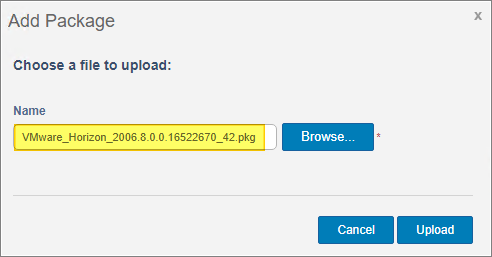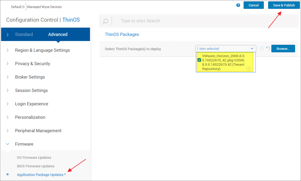 From the Apps & Data tab, click “ThinOS 9.x” from the menu on the left and “Add Package file”