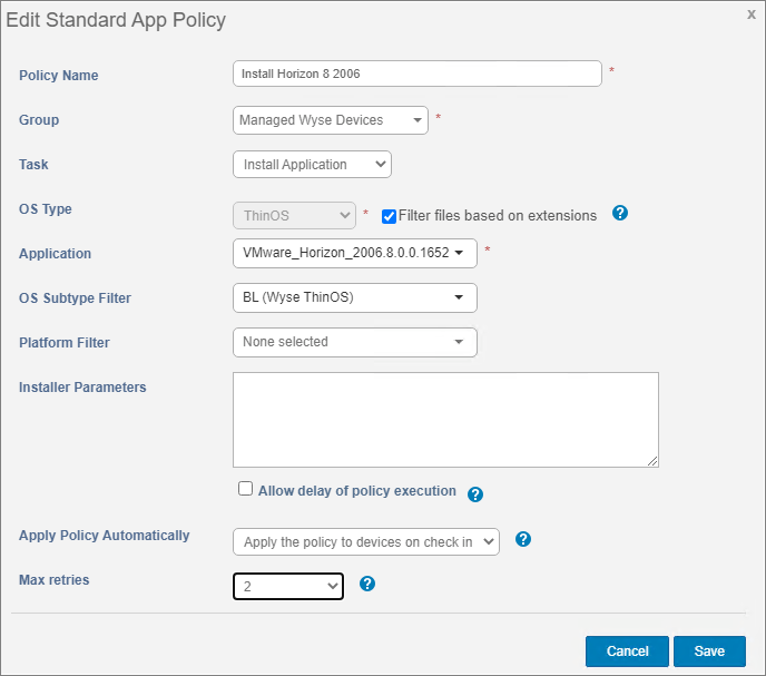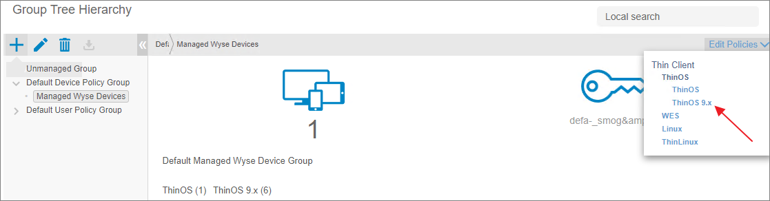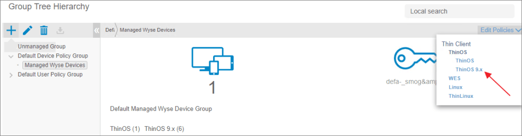 I will be using my “Managed Wyse Devices” group to upgrade the application in the devices in this group. I select “Edit Polices” and select the “ThinOS 9.x”-link