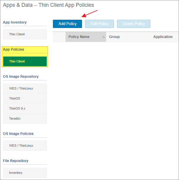 Next, from the left menu, select the “Thin Client” App Policy – Add Policy