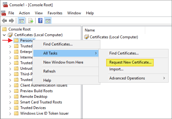 Before I can request a certificate from my domain CA, I first have to create a certificate template. How I created the certificate template for my WMS server, I have described here: Dell WMS – Certificate Template Creation. Once the certificate template is ready, I launch the certificates MMC and start the request