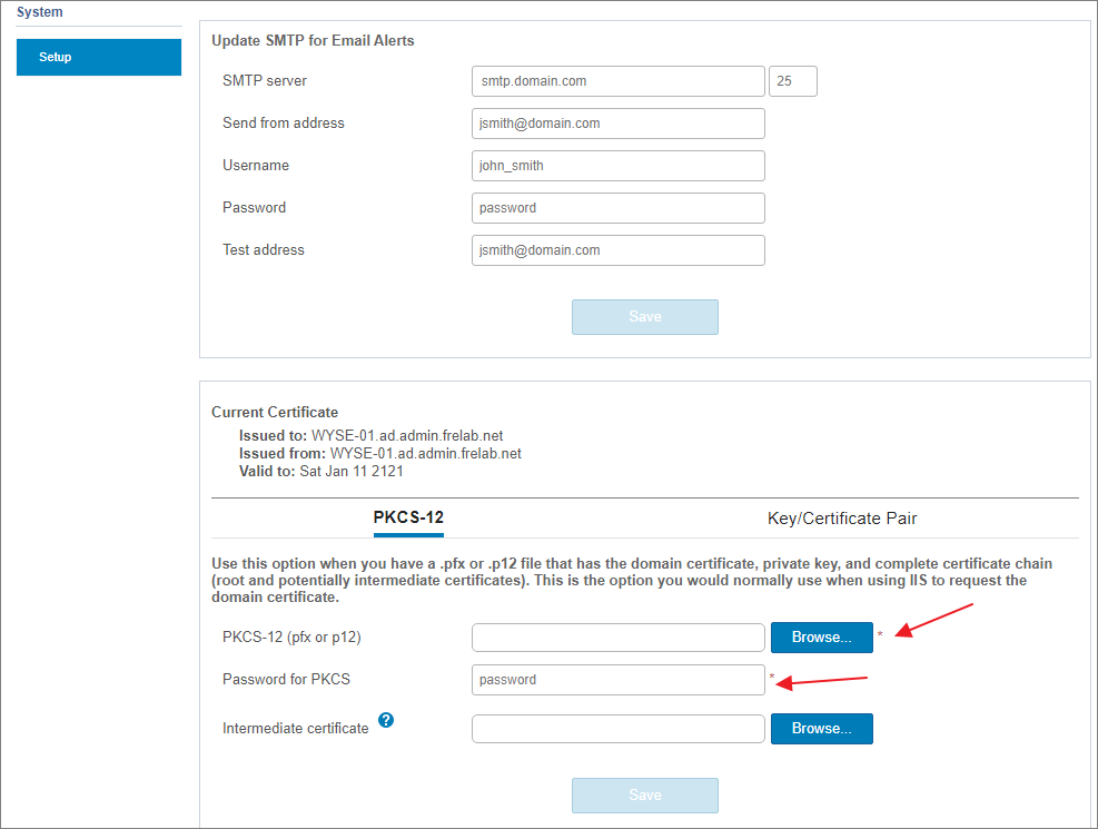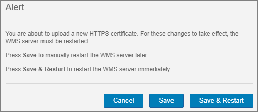 I log in to my WMS server and click Portal Administration from the top menu. From System Setup, I browse and select the certificate I exported above and provide the password. WMS now asks to save and restart in order to activate the change.