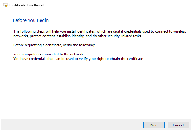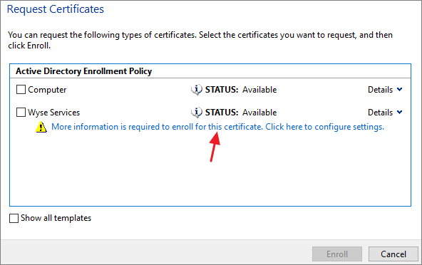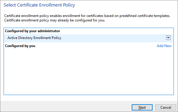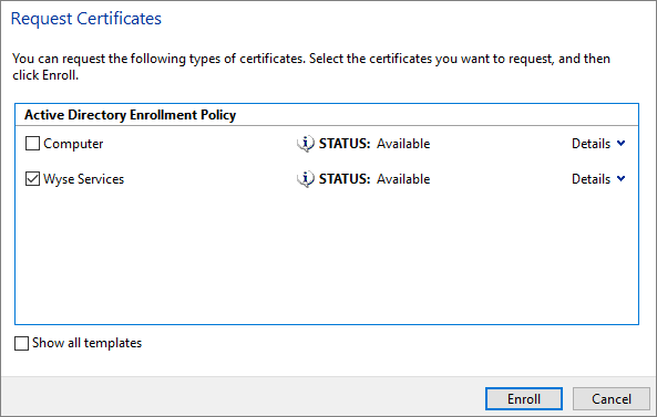 With the certificate properly configured, I select my Enrollment Policy and click Enroll…