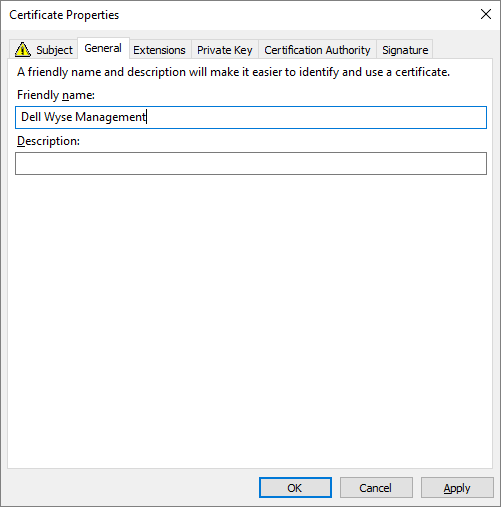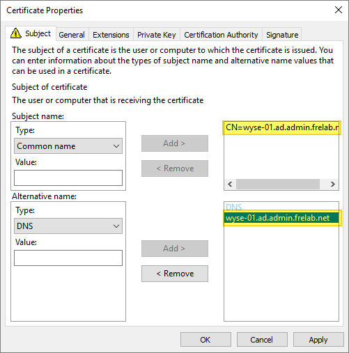 Under the Subject tab, I add my WMS server’s FQDN as Common Name and DNS
