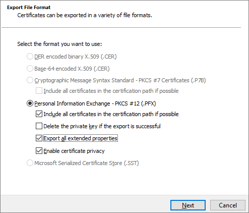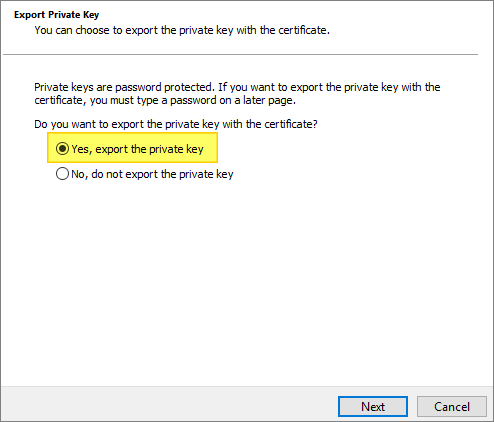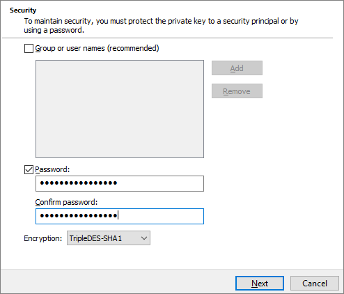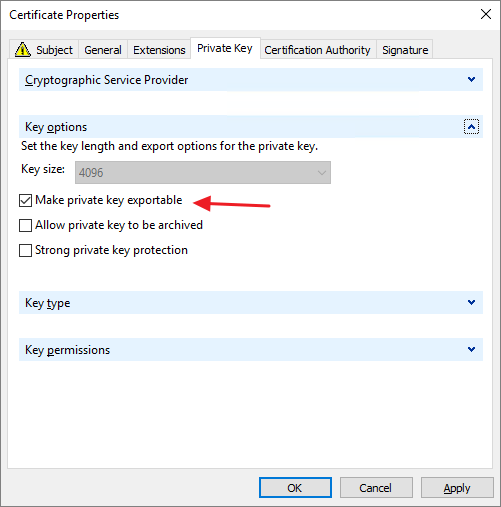 From the Private Key tab, I make sure to tick the “Make private key exportable” option, once done I click OK…