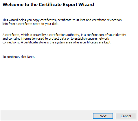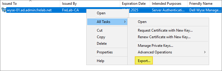 I can now see that the certificate is present in the Certificates MMC. This I will export in order to use it with Dell WMS. I right-click and select Export…