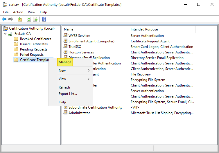 The first thing I do is to log in to my CA servers and open the CA MMC, I right-click the Certificate Templates folder and select “Manage“