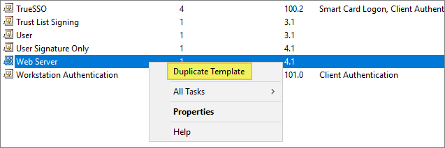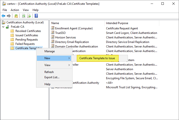 I close the Template management window and right-click the Certificate Templates folder again and select “Certificate Template to Issue“
