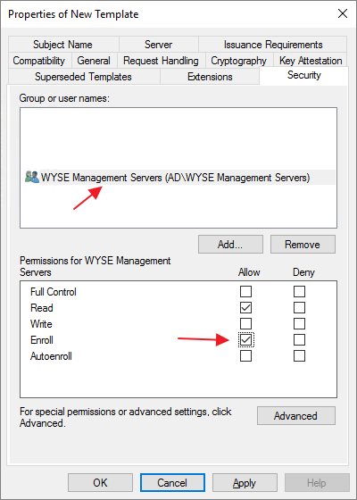 Finally, I give my WMS servers computer account “Enroll” permissions on this template through the membership in a AD group. When done, I click OK…