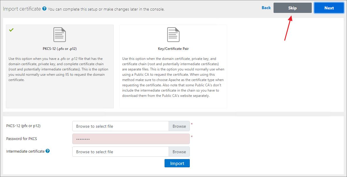 As I will do the certificate set up manually later in this guide, I click “Skip” in this screen too