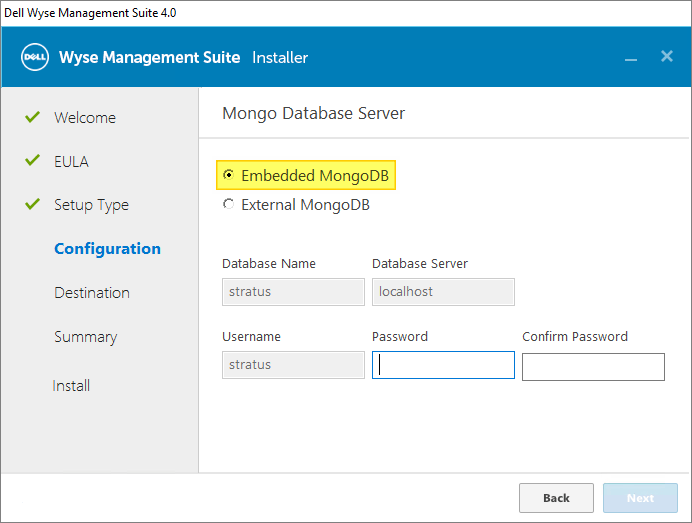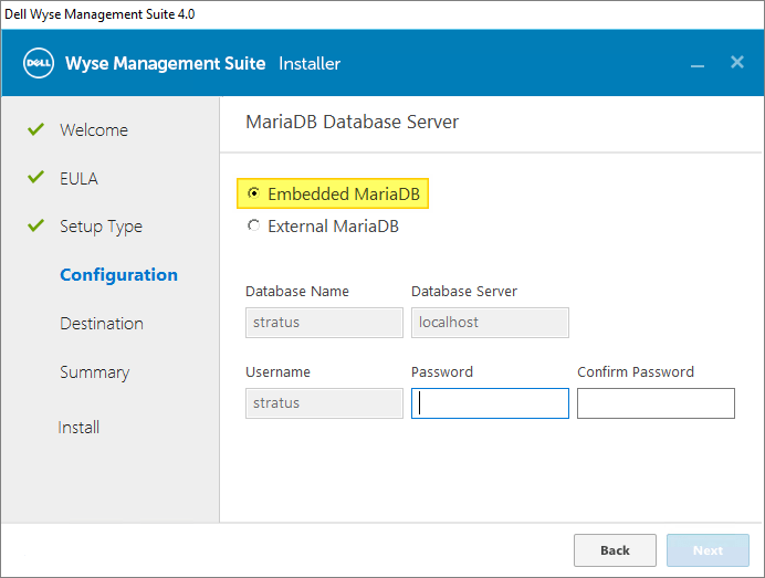 I select the Embedded Mongo and Maria DB and supply a password, Next…