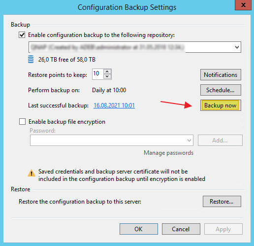Note, as I didn’t encrypt the configuration backup, I will need to edit the credentials on the new server with the correct passwords, but I now have a backup-file which I can copy to the target server.