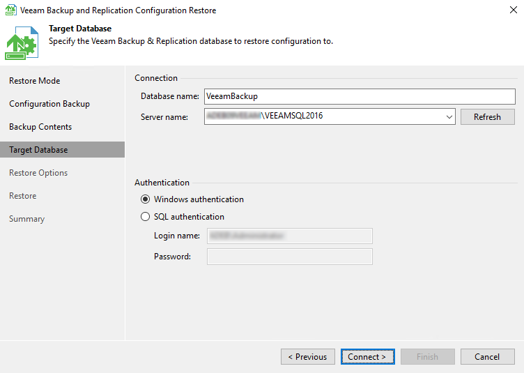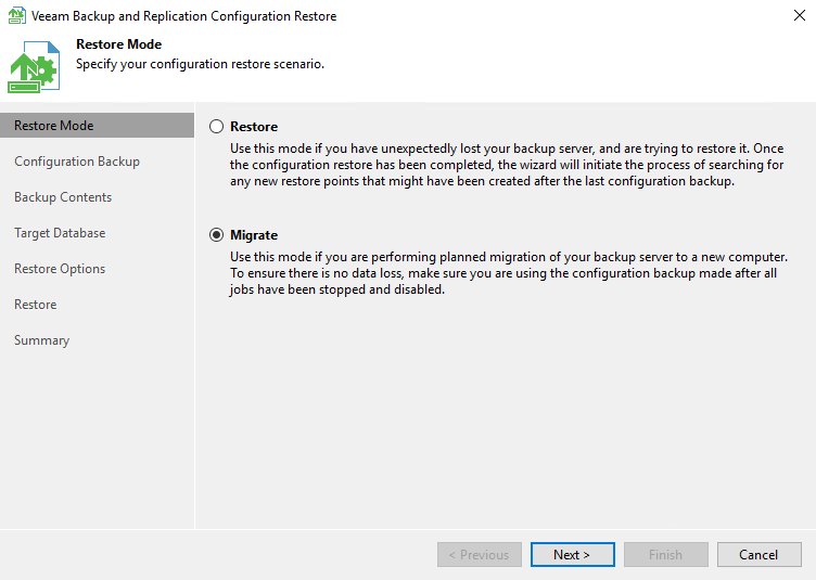 The Veeam B&R Configuration Restore Wizard launches. I select Migrate, as I’m doing a planned migration, Next…
