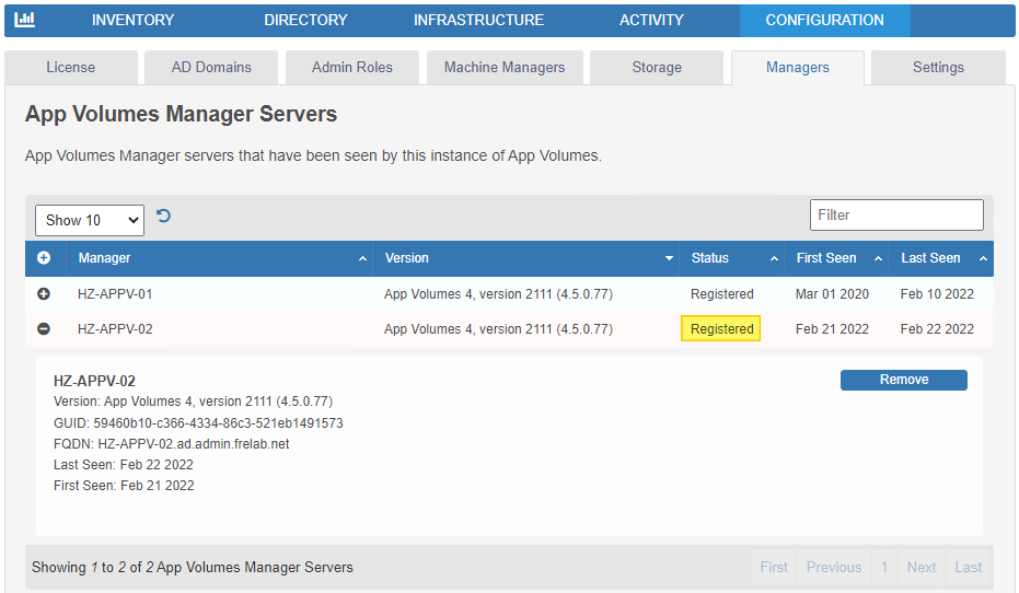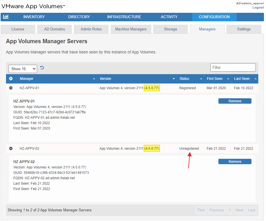 Once the new App Volumes server is rebooted, I check the status in App Volumes Manager and can see that my new App Volumes Manager is reporting in as “Unregistered“