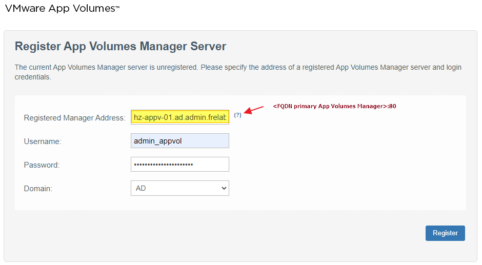 I can now restart registration, but make sure to use primary App Volumes Manager FQDN with port 80 as Registered Manager Address