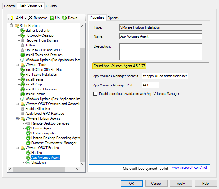 As I’ve gone over to using MDT to create templates, I will update the App Volumes Agent in the Deployment Share and run through the task sequence to create a new template. Before I begin, I open the task sequence and can see that it has found the 4.4.0.73 agent in the Deployment Share.