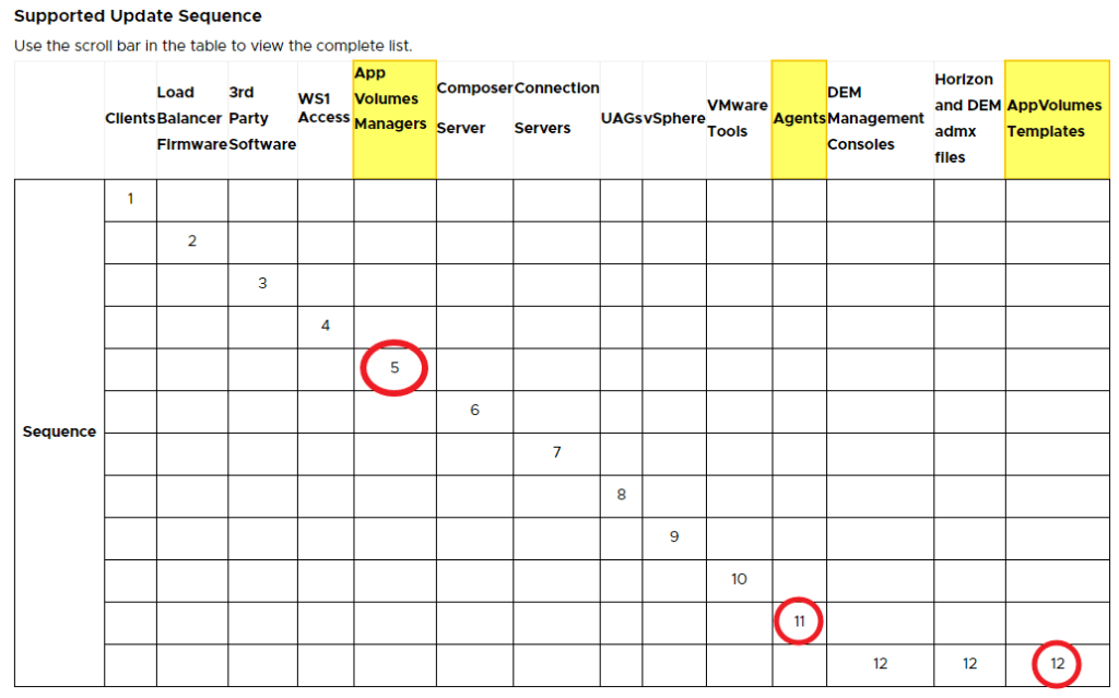 Welcome to my VMware App Volumes series. In this session I will describe the steps I took to upload the new App Volumes templates that came with the new version. According to VMware’s official documentation, Update sequence for Horizon 7, Horizon 8, and compatible VMware products (78445), this task should be done last in an upgrade sequence, as shown below.