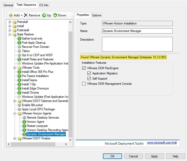 As I’ve gone over to using MDT to create VMware Horizon Windows images, I will update the Dynamic Environment Manager Agent in the Deployment Share and run through the task sequence to create a new Windows image. Before I begin, I open the task sequence and can see that it has found the 10.3.0.993 build in the Deployment Share.