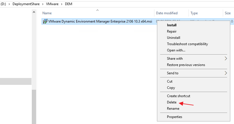 Next, I copy the new VMware Dynamic Environment Manager Agent msi-file to the “DEM” folder in the Deployment Share. It is important to make sure that the executable isn’t blocked by Windows Security, therefore I right-click the msi-file, select Properties and tick the Unblock box, if it exists. This also applies to the other executable files under the “D:\DeploymentShare\VMware” folder.