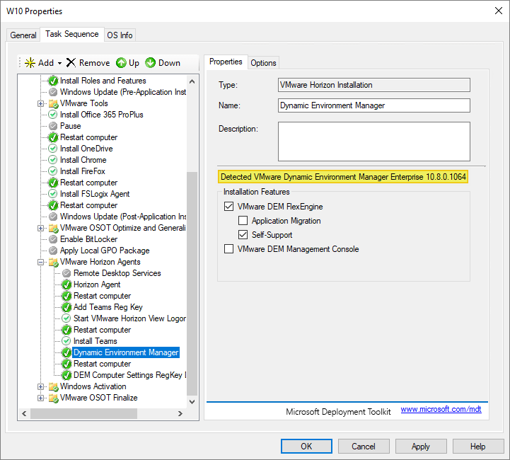 As I’ve gone over to using MDT to create VMware Horizon Windows images, described here: Automating Template Creation & Maintenance, I will update the Dynamic Environment Manager Agent in the Deployment Share, and run through the task sequence to create a new Windows image. Before I begin, I open the task sequence and can see that it has found the 10.8.0.1064 build in the Deployment Share.