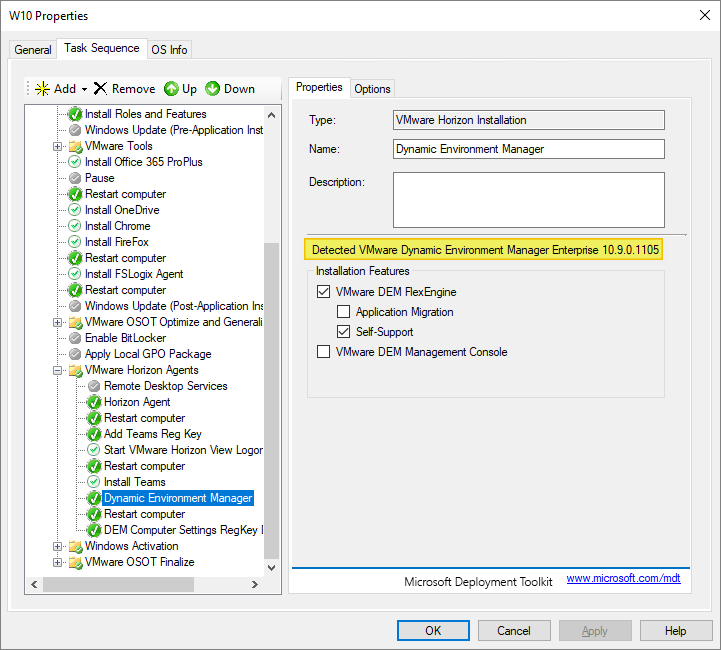As I’ve gone over to using MDT to create VMware Horizon Windows images, described here: Automating Template Creation & Maintenance, I will update the Dynamic Environment Manager Agent in the Deployment Share, and run through the task sequence to create a new Windows image. Before I begin, I open the task sequence and can see that it has found the 10.8.0.1064 build in the Deployment Share.