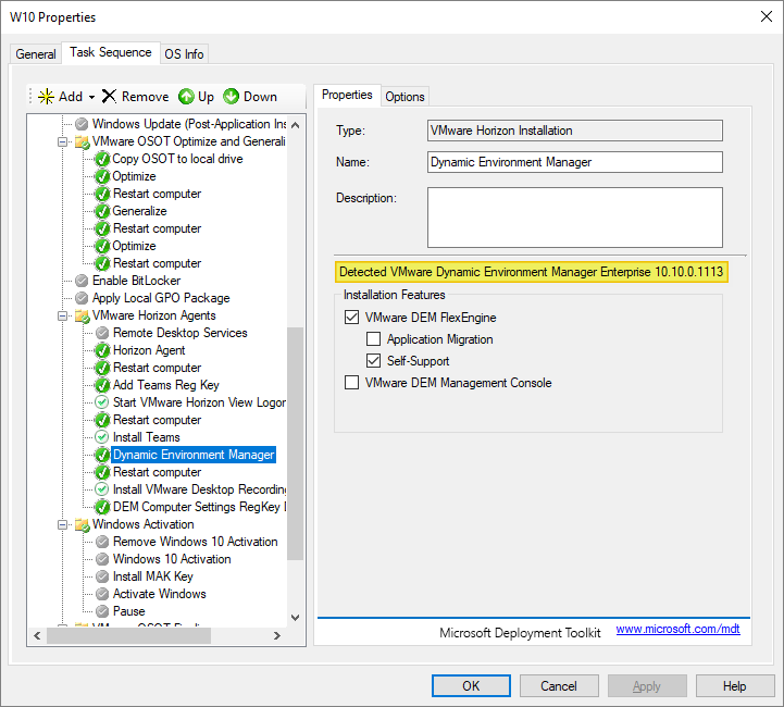 As I’ve gone over to using MDT to create VMware Horizon Windows images, described here: Automating Template Creation & Maintenance, I will update the Dynamic Environment Manager Agent in the Deployment Share, and run through the task sequence to create a new Windows image. Before I begin, I open the task sequence and can see that it has found the 10.10.0.1113 build in the Deployment Share.