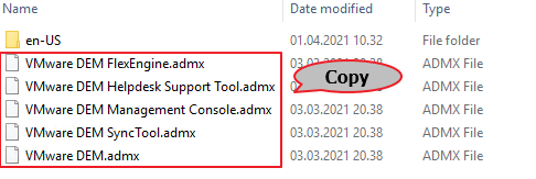 I first log in to one of my Active Directory servers, browse to the temporary folder where I downloaded the VMware-DEM-xxx-GA.zip file and extract it. Under the VMware-DEM-xxx-GA folder, there is a folder called Administrative Templates (ADMX). This is where the updated admx-templates are situated.