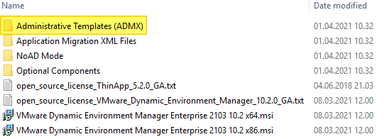 I first log in to one of my Active Directory servers, browse to the temporary folder where I downloaded the VMware-DEM-xxx-GA.zip file and extract it. Under the VMware-DEM-xxx-GA folder, there is a folder called Administrative Templates (ADMX). This is where the updated admx-templates are situated.