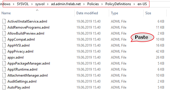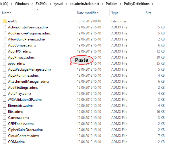 Finally, I copy and replace the adml-files from the en-US folder to “C:WindowsSYSVOLsysvolad.admin.frelab.netPoliciesPolicyDefinitionsen-US”