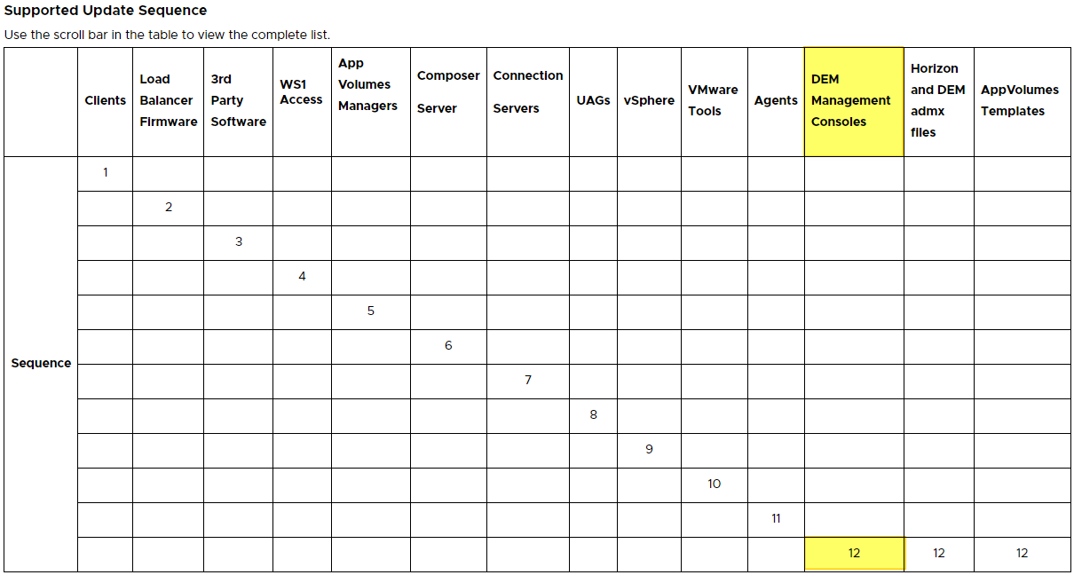 Welcome to my VMware Dynamic Environment Manager series. In this session I will describe how I upgraded the VMware DEM Management Console to v. 2309. According to VMware’s official documentation, this should be done as step 12 in the supported update sequence.