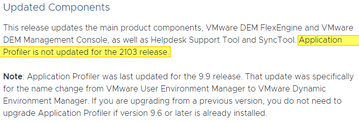 To check out all the new features and changes with VMware Dynamic Environment Manager v. 2103, check out the release notes from VMware posted here: VMware Dynamic Environment Manager Release Notes 2103