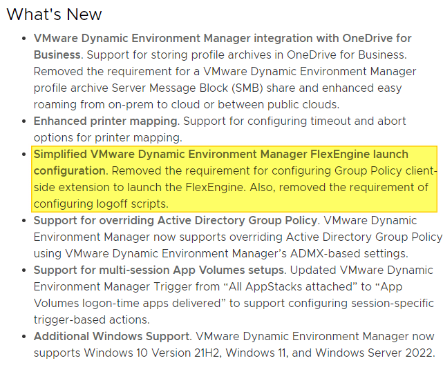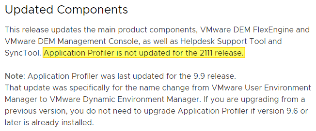 To check out all the new features and changes with VMware Dynamic Environment Manager v. 2111, review the Release Notes from VMware posted here: VMware Dynamic Environment Manager Release Notes 2111
