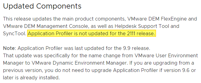 To check out all the new features and changes with VMware Dynamic Environment Manager v. 2111, review the Release Notes from VMware posted here: VMware Dynamic Environment Manager Release Notes 2111