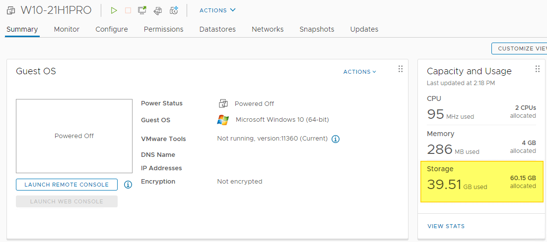 Once the Create Or Reset VMs script has run, the VM is created and shut down. As show below the disk size is almost 40 GB.
