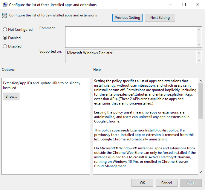 Enable the “Configure the list of force-installed apps and extensions” setting, click Show…