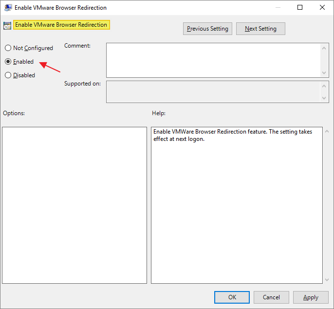 Enable the “Enable VMware Browser Redirection” setting, OK