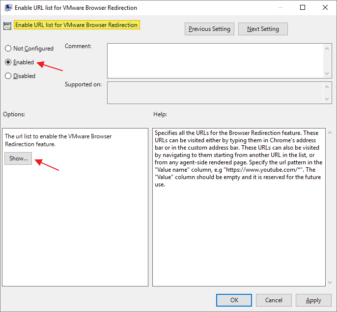 To specify which websites to redirect, enable the “Enable URL list for VMware Browser Redirection“, click Show…