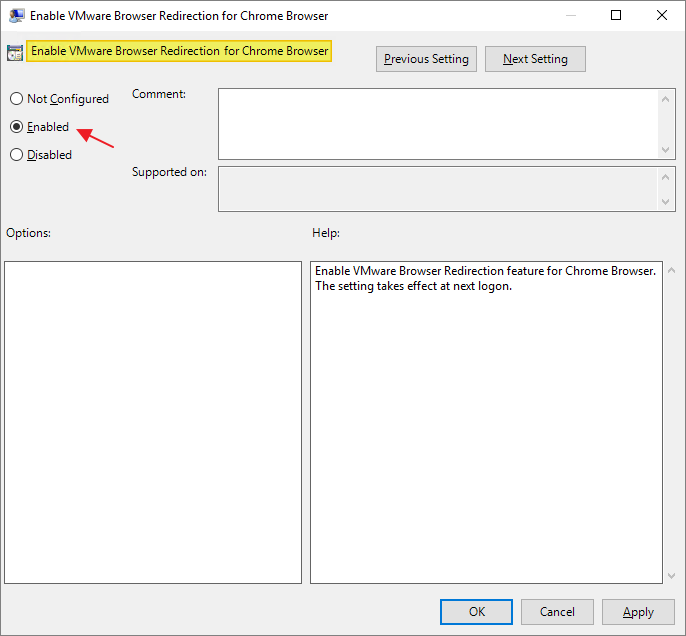 To enable browser redirect for Google Chrome, Enable the “Enable VMware Browser Redirection for Chrome Browser” setting OK