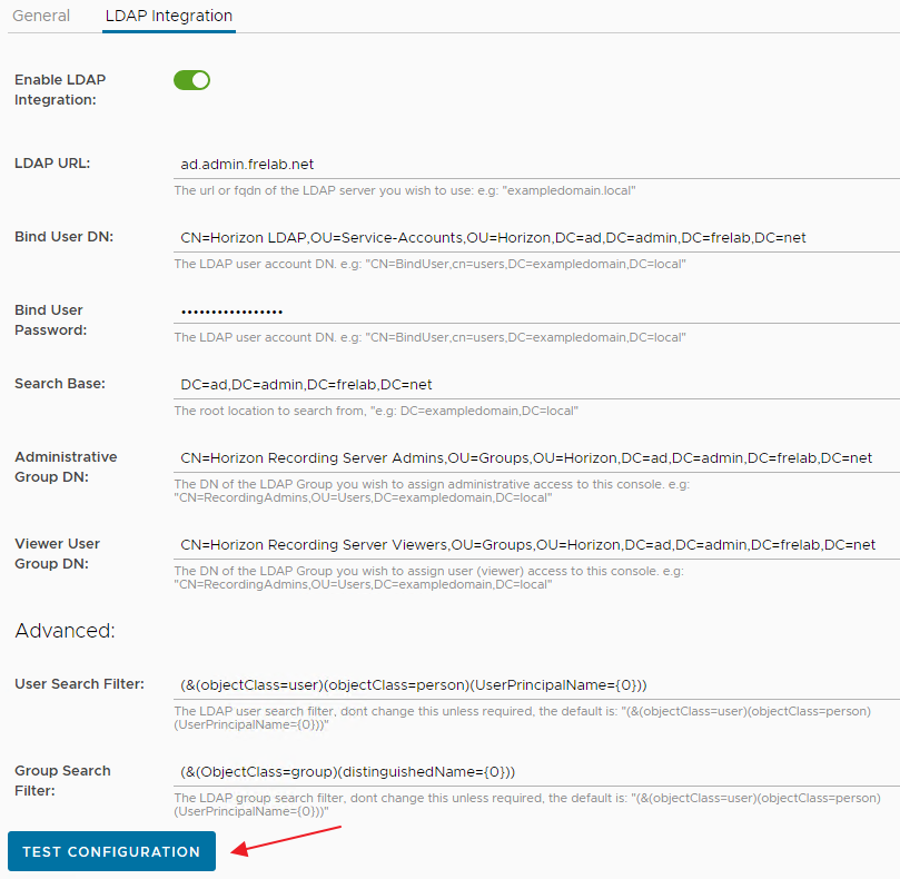 As it is quite simple to integrate the VMware Horizon Desktop Recording server with MS Active Directory using LDAP, I will be doing this. I have created two user groups for this purpose, one Administrative group and one Viewers group. To connect to my MS Active Directory I use my LDAP Bind user and define the necessary info below, I click “TEST CONFIGURATION” to verify that there aren’t any typos. Once done, SAVE…
