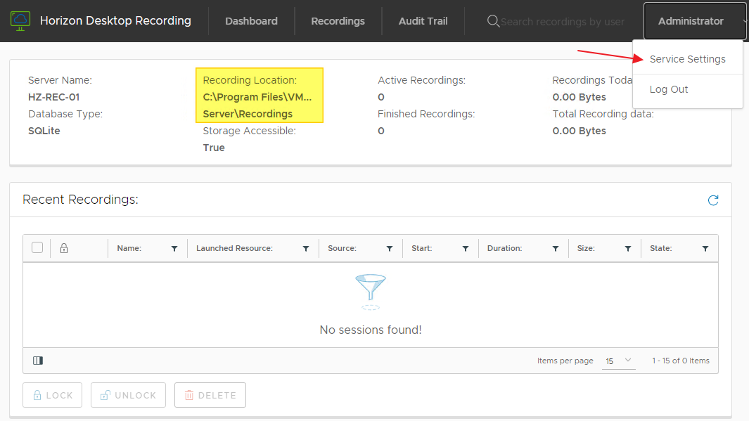 During the installation above, I didn’t have the ability to specify a separate file location for my recordings. I wanted these to be put on my D:\ partition, therefore I will change this below. I start by selecting “Service Settings” from the Administrator drop-down box.