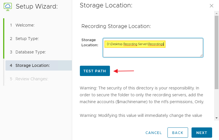 Under “Storage Location” I specify my custom location, click TEST PATH, Next…