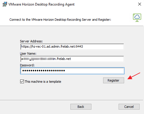 I enter the Server Address, Username and Password. As this will be a VMware Horizon template vm, I select “This machine is a template“, before I click “Register“