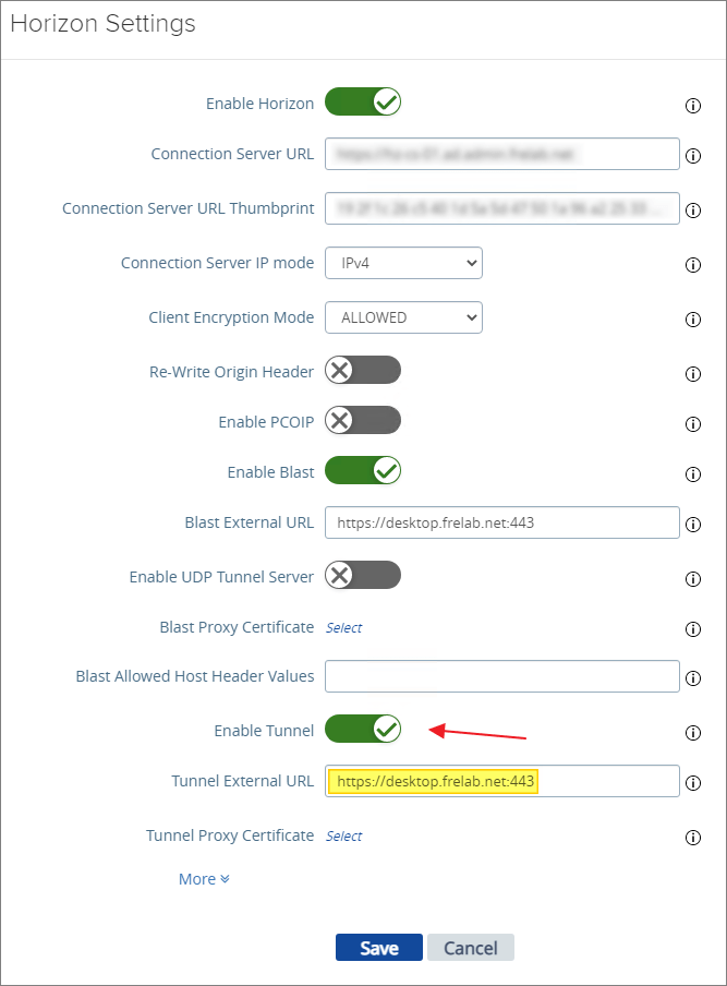 To configure the Secure Tunnel in the UAG’s, configure the Horizon Settings as show below.