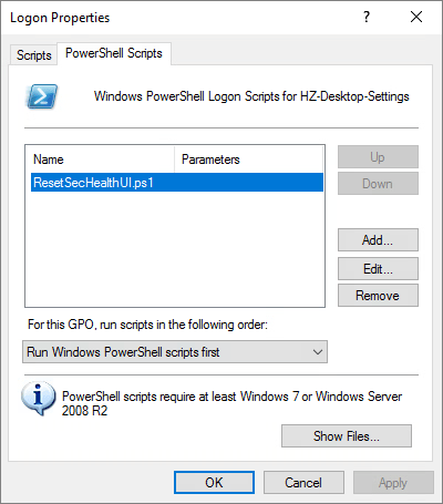 The solution to the problem was to create a small script that re-registers the SecHealthUI App Package, which I set to run at User Logon, as shown below.