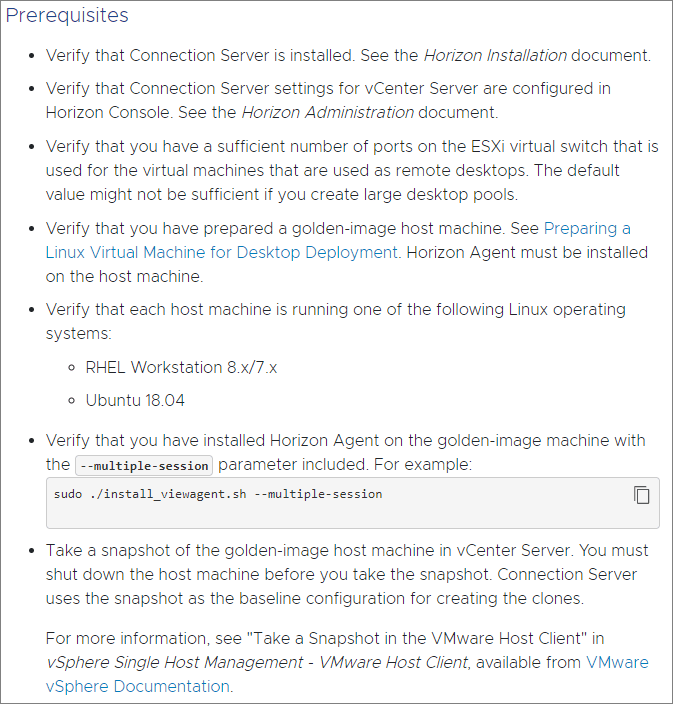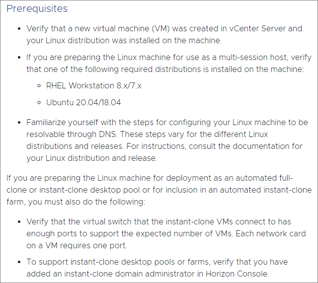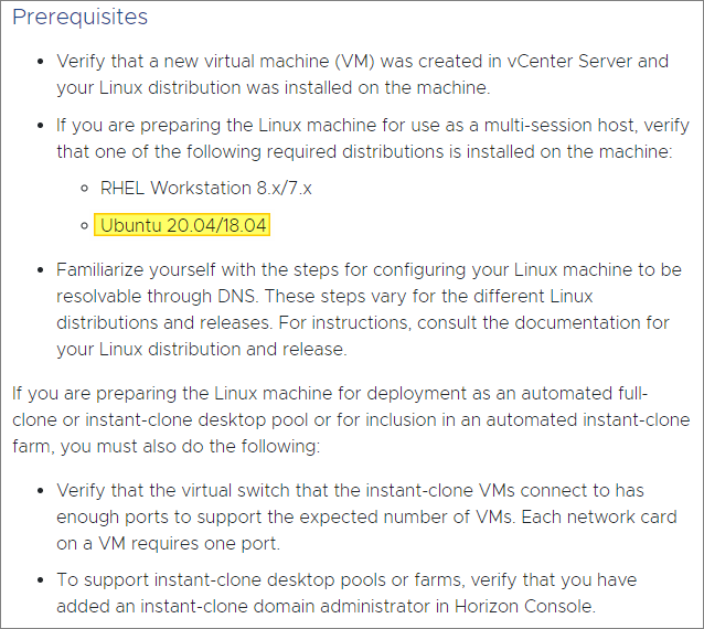 Below are some of the prerequisites. I will be using Ubuntu 20.04 in a virtual machine with good working DNS in my environment and there are more than enough ports in my port groups to support my Instant Clone pools. So, for these prerequisites, I check all the boxes.