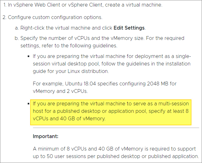 Lastly, as this will be a multi-user environment, it is important to validate the sizing of vCpu and vMem for the VM’s, as described by VMware below